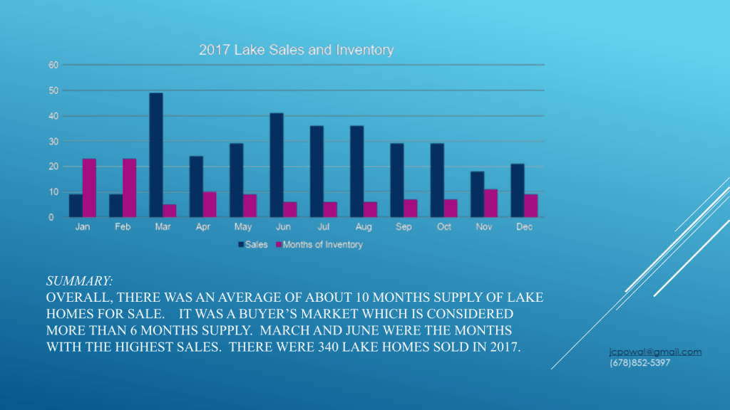 In 2017, you can see that there was an average of about 10 months supply of lake homes for sale. It was a buyer’s market, which is considered more than 6 months supply. March and June were the months with the highest sales. There were 340 lake homes sold in 2017.