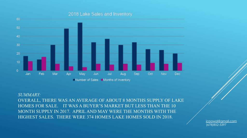 In 2018, there was an average of about 8 months supply of lake homes for sale. It was a buyer’s market but less than the 10 month supply in 2017. April and May were the months with the highest sales. There were 374 lake homes sold in 2018.