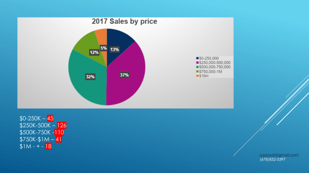 In 2017, lake sales slightly favored the $250k-500k range at 37%, though only slightly ahead of $500k-$750k homes coming in at 32%. Eighteen $1M + homes were sold, landing the highest range at %5 of all sales.