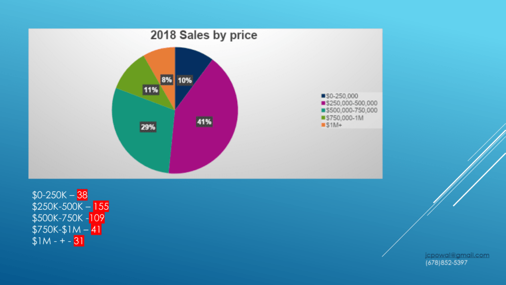 In 2018, $250k-$500k sales absorbed some of the $500k-$750k sales, moving them to 41% and 29% respectively. Meanwhile $1M+ home sales jumped to 8% from the previous year.