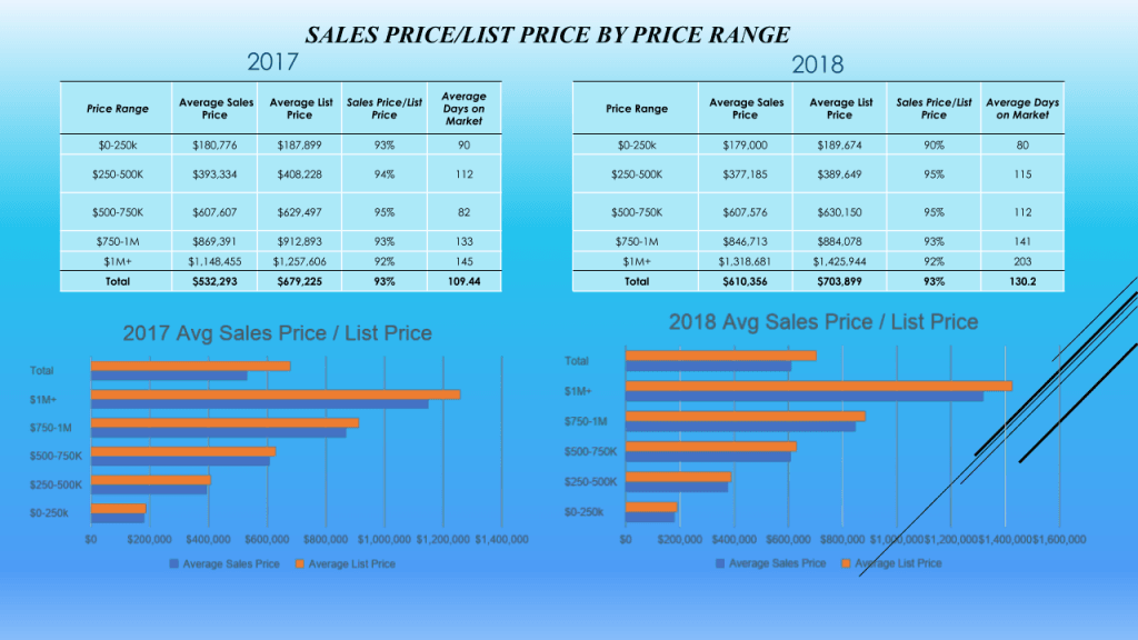 Between 2017 and 2018, sale price/list price averages held mostly steady. There was a slight drop in home sales under $250k from 93% to 90%, but $250k-$500k homes increased by 1% to 95%, and every other bracket maintained their average.