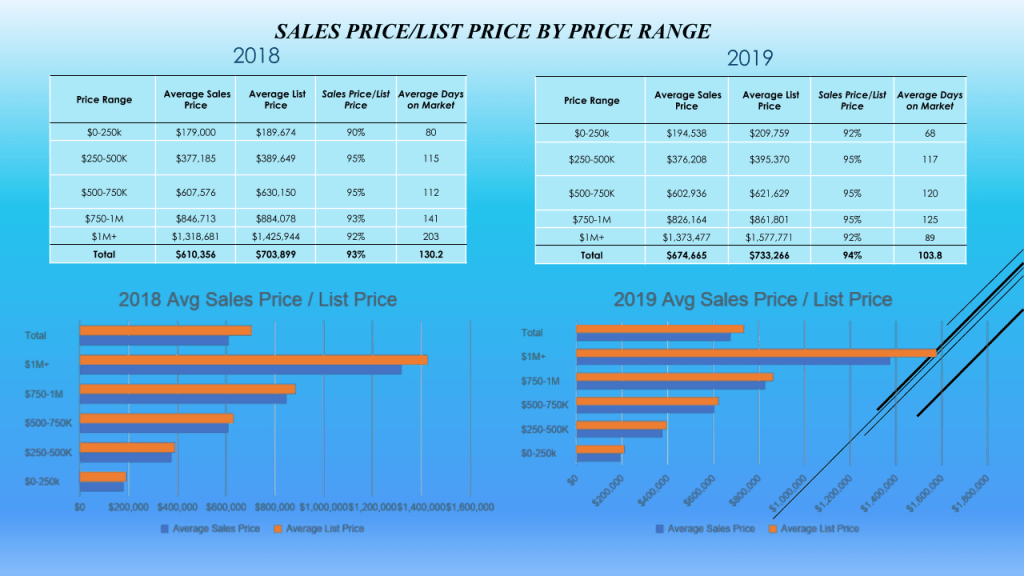 2018 to 2019 averages also held fairly steady, seeing an increase of 2% in both sales under $250k and in the $750k-$1M range. Other brackets remained the same for a total average increase of 1% from 93% to 94%.
